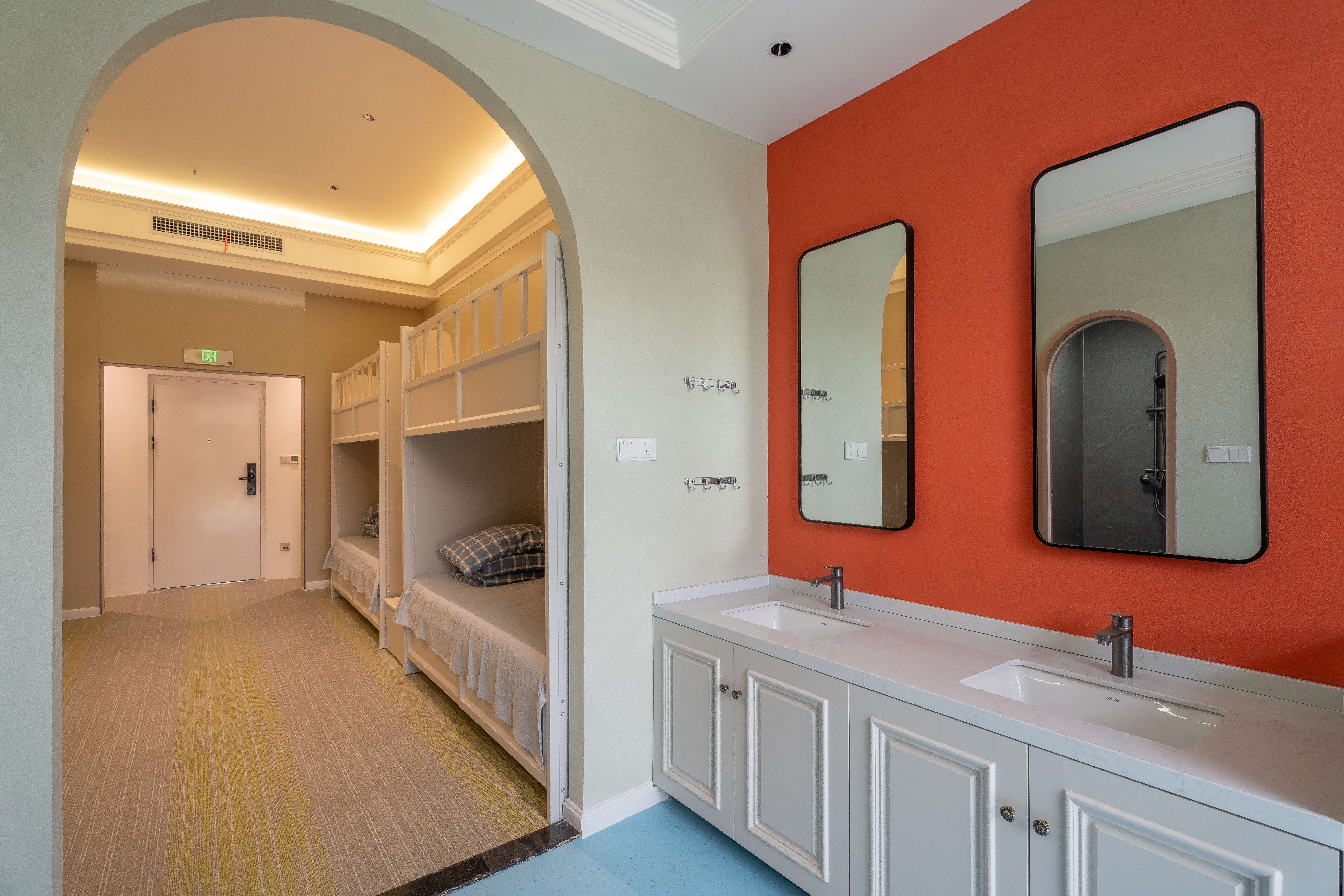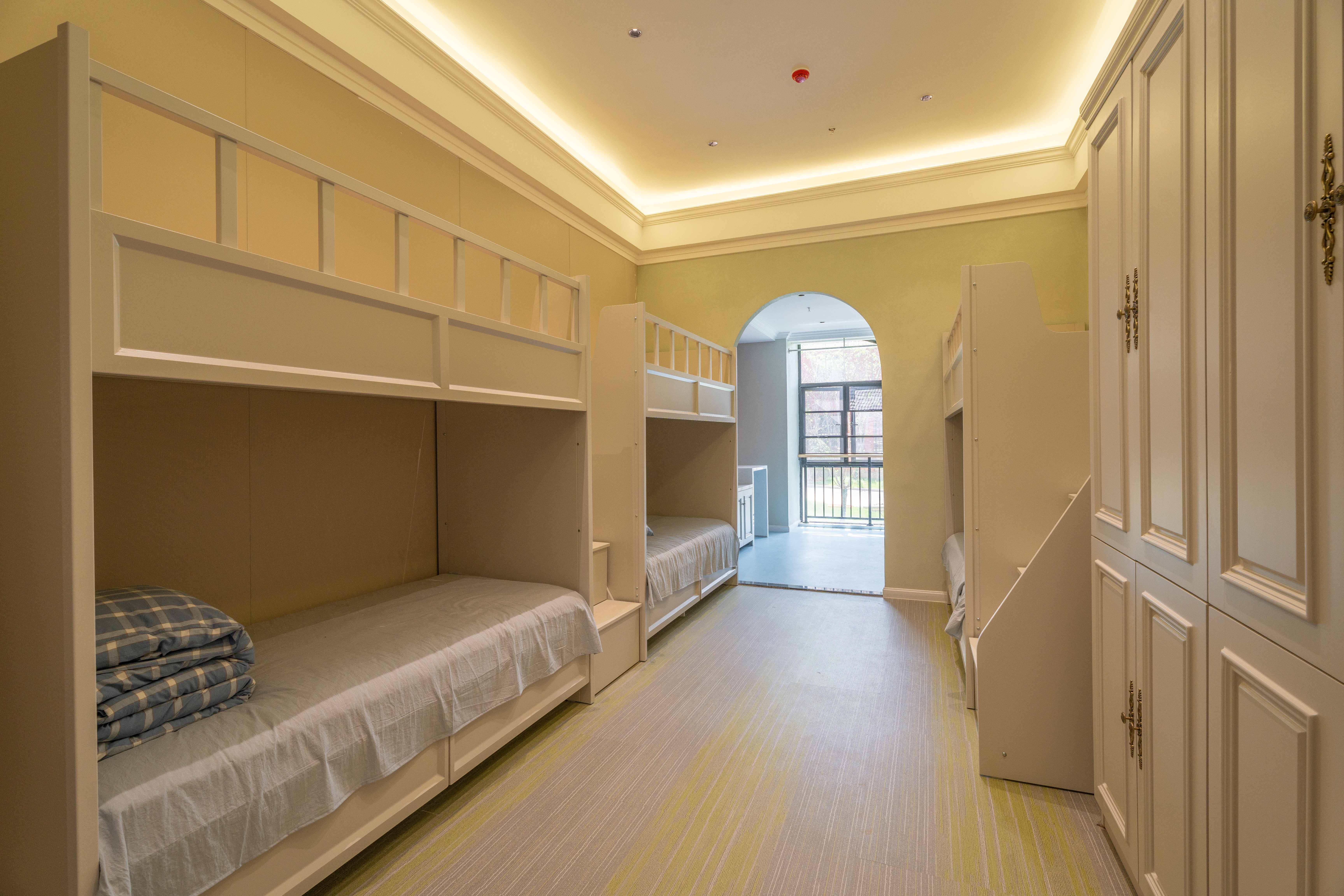 宿舍标配中央空调,双洗手间和淋浴,早上洗漱高峰期也不用排队等待,孩子们能节省不少时间。而且宿舍干净整洁,空间布局也很合理,每个孩子都有自己独立的存储空间,能摆放个人物品。