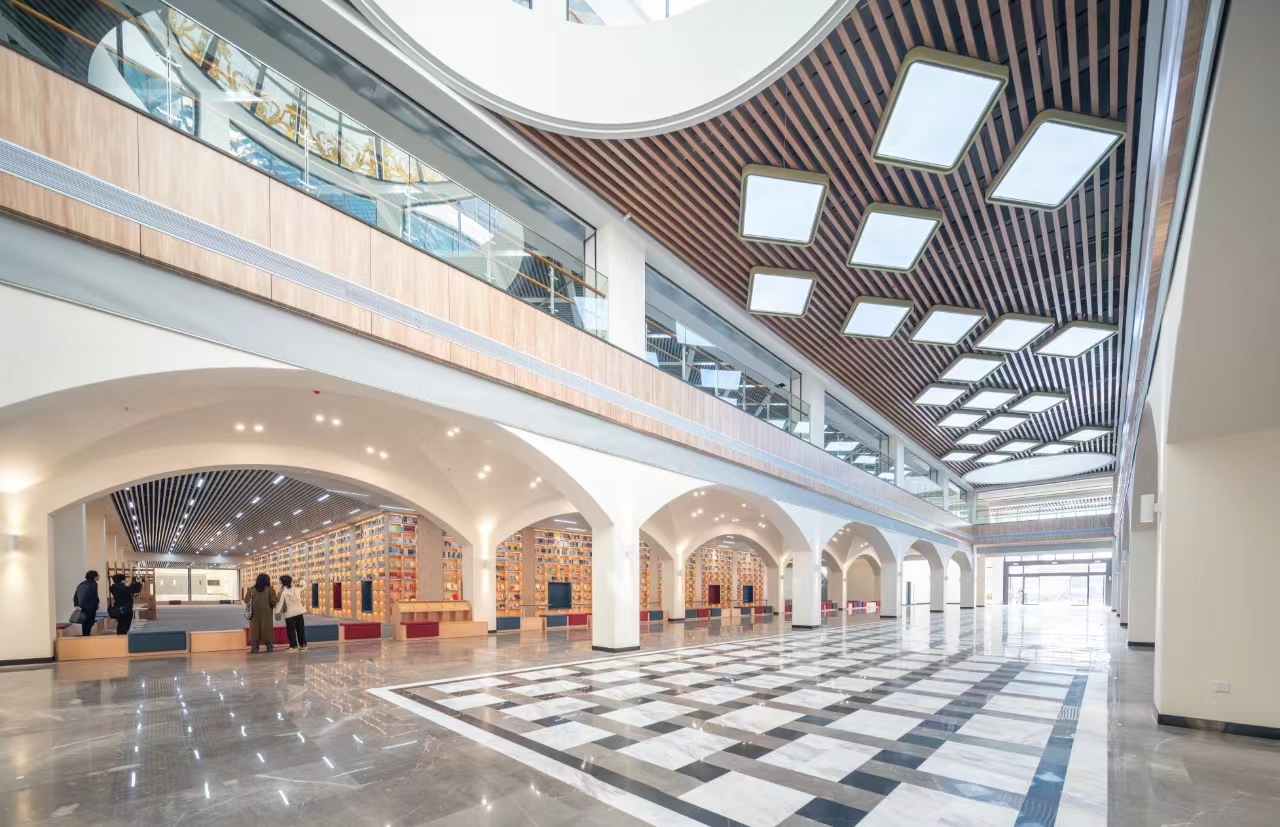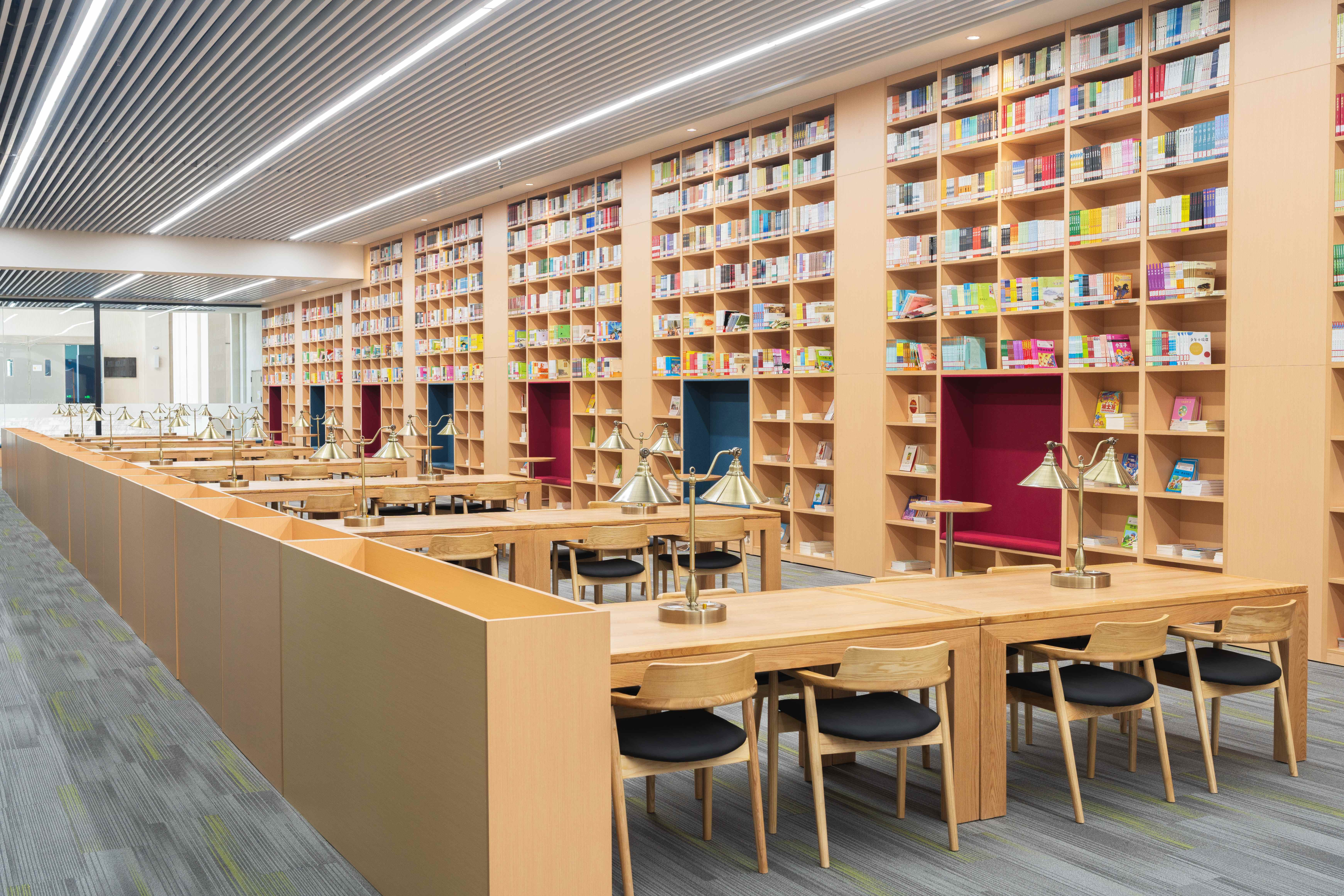 知识殿堂:步入图书馆,阳光透过整面落地窗倾泻而入,高大的书架上,上万册书籍整齐陈列,沿窗而设的自习区,简约的原木桌椅排列有序,为学子们提供舒适的学习空间。