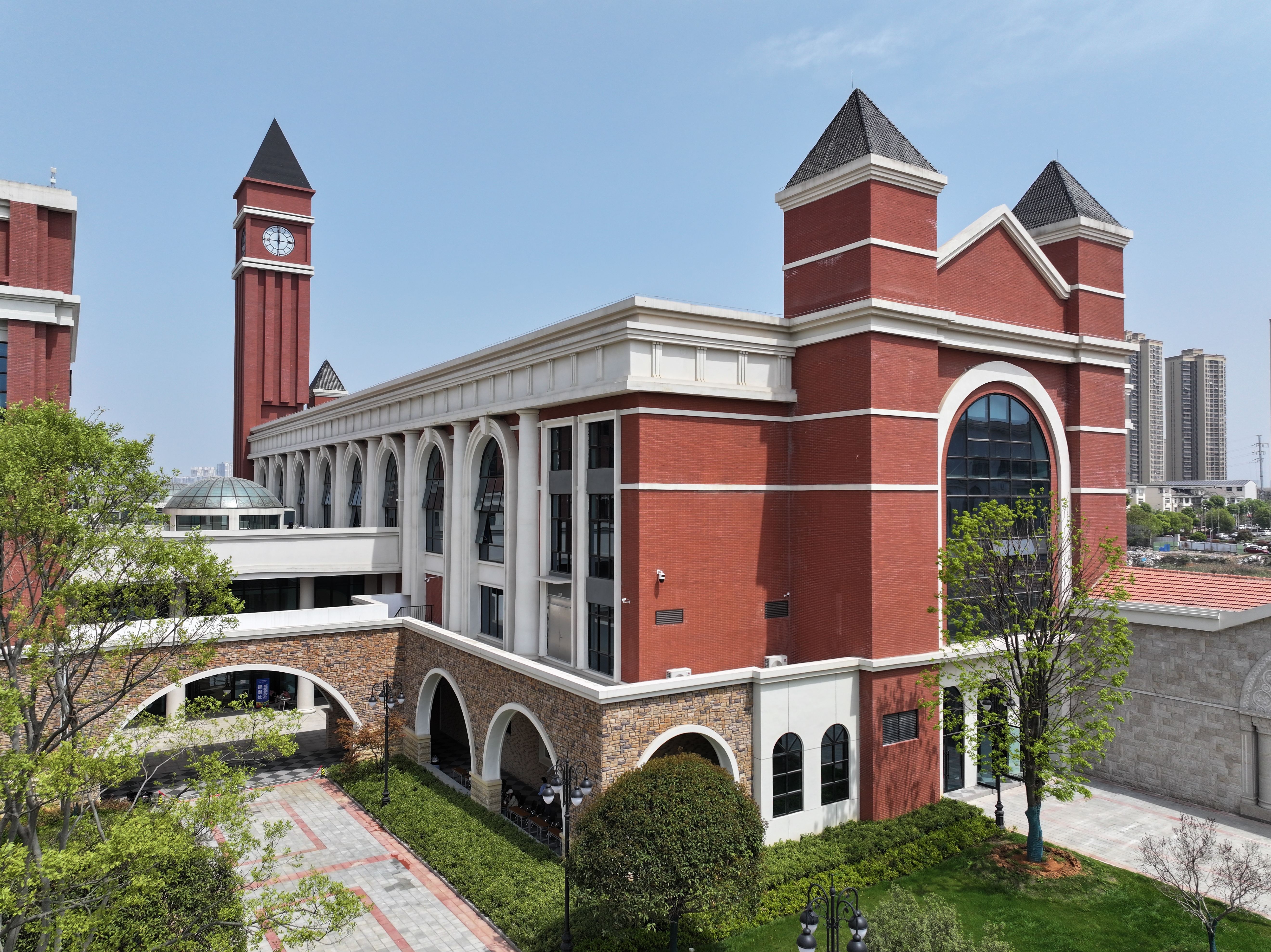 建筑之美:走近校园,首先征服视线的是那独具匠心的建筑外立面,教学楼采用新古典主义风格的对称廊柱与拱形窗棂,红砖墙面与白色装饰线形成优雅的视觉韵律;每一处屋檐的弧度,每一扇窗棂的线条,都在诉说建筑与人文交织的隽永乐章。